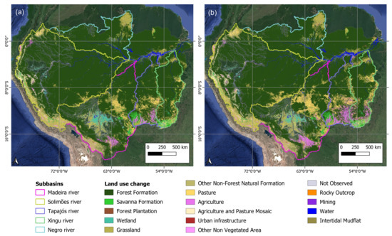 Land cover changes within the borders of the Amazon Basin based on classification procedures adopted by MapBiomas: (a) 2001 (on the left) and (b) 2021 (on the right).