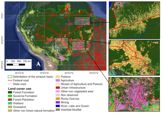 Roads within the Brazilian Amazon jointly with the land use and land cover in the Amazon region.