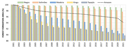 The analysis carried out from 2001 to 2021 revealed that, among the sub-basins mentioned, the sub-basins of the Negro and Solimões rivers stand out with the smallest variation in the loss of forest cover, of 1.2% and 2.4%, respectively. It can be highlighted that the deforestation curve in these basins had an approximately linear behavior over time.