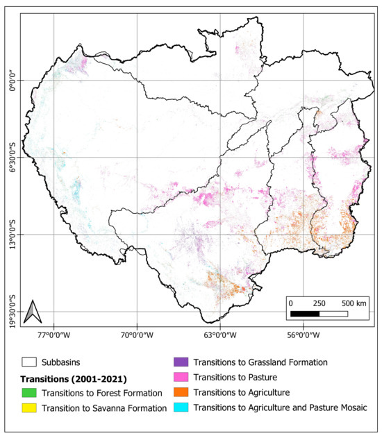 The analysis of transitions in the LULC was carried out, focusing on the five main sub-basins, namely Tapajós, Xingu, Madeira, Solimões and Negro, in order to obtain a deeper understanding of the trends of change.