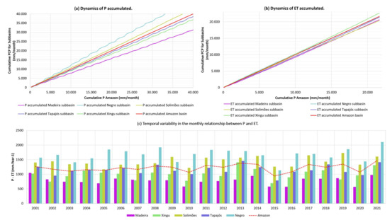 Dynamics and evolution of P and ET accumulated over the years (2001–2021) in the Amazon Basin and in its main sub-basins: (a) monthly cumulative precipitation for each sub-basin versus Amazon Basin; (b) monthly cumulative evapotranspiration for each sub-basin versus Amazon Basin; (c) monthly temporal variability of the difference between P and ET for each sub-basin in contrast to the Amazon Basin (red dotted line).