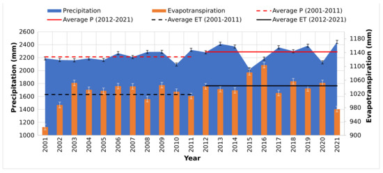 When comparing the average P and ET in the Amazon Basin (Figure 8), the values increased between the years 2013 and 2021 (ET: ; P: ) compared to the period from 2001 to 2006 (ET: ; P: ), resulting in an increase of 2.36% and 3.26%, respectively.
