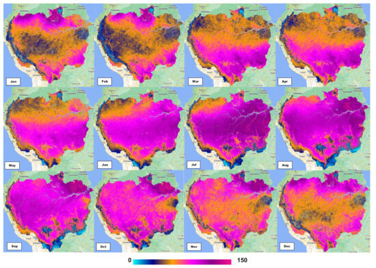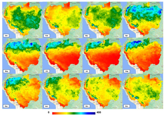 From this, when analyzing, it is noticeable that during this period, there are lower precipitation values throughout the basin and high precipitation values. This phenomenon is linked to the natural cycle of the forest, as at this time, some trees lose their leaves, allowing greater sunlight into the understory, which creates favorable conditions for the growth of new trees and plants. Furthermore, many trees in the Amazon produce seeds during the dry season, which germinate when the dry season begins, taking advantage of the availability of light and space.