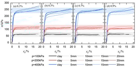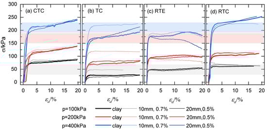 The deviator stress varied with strain at confining pressures of 100 kPa, 200 kPa, and 400 kPa for stress paths of CTC, TC, RTE, and RTC, which are shown in Figure 8a–d, respectively. The bare clay and fiber-reinforced clay samples with fiber of 10 mm 0.7% and 20 mm 0.5% have been utilized to compare the stress path efforts on the fiber reinforcement of clay samples. Figure 8a shows that the deviator stress varies the strain of fiber-reinforced clay under CTC conditions. The deviator stress of fiber-reinforced clay samples is lower than that of bare clay samples at confining pressures of 100 kPa and 200 kPa, indicating that the fibers may weaken the clay samples at lower stress levels. Conversely, Figure 8b shows that the deviator stress varies the strain of fiber-reinforced clay under TC conditions. The deviator stress of fiber-reinforced clay samples is mostly larger than that of bare clay samples at all confining pressures, indicating that the fibers enhance the shear strength of the clay samples. Figure 8c shows that the deviator stress varies the strain of fiber-reinforced clay under RTE conditions. The deviator stress of fiber-reinforced clay samples is mostly lower or a little lower than that of bare clay samples at all confining pressures which suggests that the fibers weaken the shear strength of the clay samples. Figure 8d shows that the deviator stress varies the strain of fiber-reinforced clay under RTC conditions. The deviator stress of fiber-reinforced clay samples is mostly higher than that of bare clay samples at all confining pressures, indicating that fibers increase the shear strength of the clay samples. However, compared with Figure 8a–d, the deviator stress depicted in TC, RTE, and RTC conditions is smaller than that revealed in the CTC condition. In particular, the deviator stress depicted in RTE is the lowest among them. Additionally, regarding the deviator stress of the samples, the fibers may weaken the clay samples under unloading conditions.