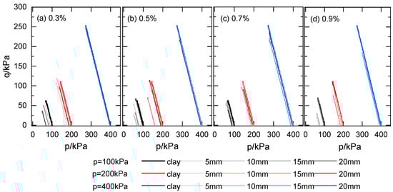 Figure 5a–d compare the stress path in the total stress method of palm fiber-reinforced clay samples with bare clay at confining pressures of 100 kPa, 200 kPa, and 400 kPa. The fiber content of reinforced clay is assembled as 0.3%, 0.5%, 0.7%, and 0.9% in mass, respectively. With a fiber content of 0.3%, as shown in Figure 5a, the stress path lines of palm fiber-reinforced clay are shorter than that of bare clay at a confining pressure of 100 kPa, whereas they are a little longer and almost equal to that of bare clay for confining pressures of 200 kPa and 400 kPa, respectively. With a fiber content of 0.5%, as shown in Figure 5b, the stress path lines of palm fiber-reinforced clay are much shorter than that of bare clay at a confining pressure of 100 kPa as well as 200 kPa and 400 kPa, except from the fiber-reinforced simple with a fiber length of 20 mm. With a fiber content of 0.7%, as shown in Figure 5c, the stress path lines of palm fiber-reinforced clay are a tiny amount shorter than, or similar to, that of bare clay in the three confining pressures. Finally, with a fiber content of 0.9%, as shown in Figure 5d, the stress path lines of palm fiber-reinforced clay are much shorter than that of bare clay at all confining pressures.