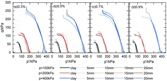 The stress path in effective stress of palm fiber-reinforced clay samples at confining pressures of 100 kPa, 200 kPa, and 400 kPa are compared with bare clay in Figure 6a–d, where fiber content varied from 0.3% to 0.5%, then to 0.7%, and ultimately to 0.9%. With a fiber content of 0.3%, as shown in Figure 6a, the stress path lines of palm fiber-reinforced clay are almost equal to that of bare clay at a confining pressure of 100 kPa; at a confining pressure of 200 kPa, the stress path lines are similar to each other, yet at a confining pressure of 400 kPa, the stress path lines of palm fiber-reinforced clay are somewhat much higher than that of bare clay. With a fiber content of 0.5%, as shown in Figure 6b, the stress path lines of palm fiber are mostly higher than that of bare sand, indicating that the fibers indeed increase the strength of clay samples. When the fiber content increases from 0.5% to 0.7%, the strength of the fiber increases a little more at a confining pressure of 200 kPa, but at confining pressures of 100 kPa and 400 kPa, the strength of the reinforced clay samples does not increase significantly. Finally, when the fiber content varies from 0.7% to 0.9%, the strength of the fibers weakens a little for all confining pressures (see Figure 6d).