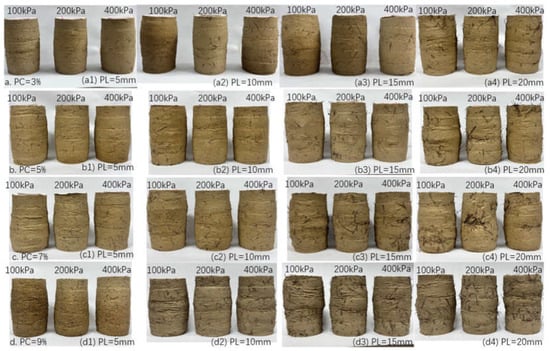 Figure 7a shows the failure samples at different confining pressures and fiber lengths with a fiber content of 0.3%. They all present as a middle inflation failure, especially for fiber lengths of 10 mm and 15 mm at 100 kPa confining pressure. The fibers are starting to be visible around the sample when fiber content increased to 0.5% or fiber length increased to 10 mm, as shown in Figure 7(a2,b–d). As the fiber content increased from 0.7% to 0.9%, the local failure is more evident than the middle inflation failure for the reinforced clay samples with fiber lengths of 15 mm and 20 mm, as shown in Figure 7(c3,c4,d3,d4). With regard to this issue, the non-uniform long fibers distributed in the clay may weaken the local strength of the clay samples. Additionally, a large amount of fiber will make it more possible to intertwine or interweave with each other, which may produce a weak surface in the sample. Both of these reasons can lead to local failure of the fiber-reinforced clay sample.