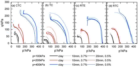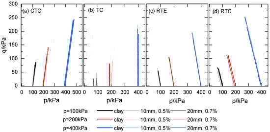 Figure 9a–d depict the four types of stress paths (CTC, TC, RTE, and RTC) of the clay samples in terms of total stress using the p-q system. The samples include bare and fiber-reinforced clay samples assembled as 10 mm 0.7% and 20 mm 0.5%. Figure 9a shows the stress path of fiber-reinforced clay under CTC conditions. The stress lines increase slowly with spherical stress. In contrast, they remain constant as a vertical line for the TC condition, as shown in Figure 9b. On the contrary, the deviator stress decreases with spherical stress for RTE and RTC condition, as shown in Figure 9c,d. Most of the stress path lines of the fiber-reinforced clay samples are shorter than those of bare clay which suggests that the fiber may weaken the strength of clay in terms of total stress.
