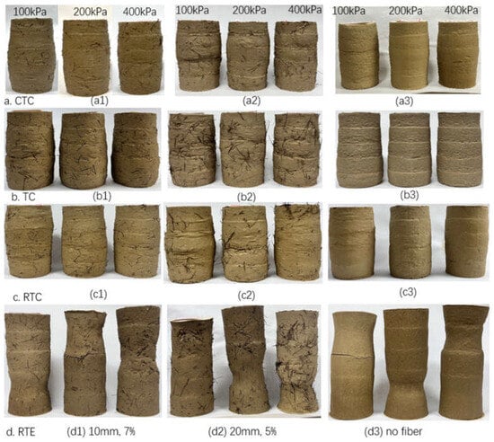 Failure samples for four stress paths with selected fiber length and fiber content: stress path in rows: (a) CTC, (b) TC, (c) RTC, and (d) RTE; samples in column: (1) 10 mm 7%, (2) 20 mm 5%, and (3) bare clay.