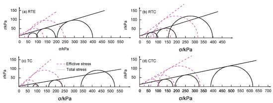 Figure 12 shows the intensity envelopes of total stress and effective stress at a confining pressures of 100 kPa, 200 kPa, and 400 kPa for bare clay under four different stress paths with the τ-σ system. From the intensity envelopes, the shear strength parameters can be obtained as listed in Table 4 in terms of total stress and effective stress, as described in Equation (3) as follows: