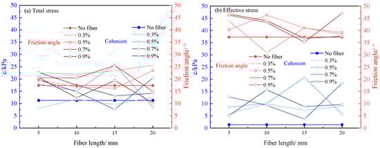 - In the RTC condition, fibered clay mainly increases cohesion, one of the shear strength parameters, in terms of total stress, while it also increases friction angle in terms of effective stress. For short fibers, the coefficient of strength reinforcement of the fibered clay increases with fiber content; conversely, for long fibers, this reinforcement may become weaker, as long fibers may cluster or weaken along their longitude.