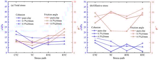The fiction angle and cohesion of fiber-reinforced clay varies with fiber length, compared with those of bare clay in Figure 13, both in terms of total stress and effective stress. In terms of total stress, the shear strength parameters, such as friction angle and cohesion, remain relatively stable with different fiber lengths and contents, as shown in Figure 13a. Fiber reinforcement occurs with strength parameters mostly higher than those of bare clay. However, they are not significantly affected by fiber length and content. However, in terms of effective stress, the shear strength parameters, especially the values of cohesion, increase obviously, revealing that the fibers make efforts on reinforcement, as shown in Figure 13b. The other stress path (CTC, TC, and RTE) conditions are also compared with RTC conditions in Figure 14. Fibered clays assembled as 10 mm 0.7% and 20 mm 0.5% are compared with bare clay. In terms of total stress, the friction angle remains relatively stable for the CTC and TC conditions. At the same time, it is a little larger for the RTC condition and decreases slightly for the RTE condition, as shown in Figure 14a. Contrarily, the cohesion of fibered clay increases obviously for CTC and TC conditions. At the same time, it is varied with the RTC and RTE conditions. In terms of effective stress, the friction angle increases significantly for the CTC and RTC conditions, while it decreases sharply for the TC and RTE conditions, as shown in Figure 14b. Cohesion increases slightly for the CTC, TC, and RTC conditions. Nevertheless, it falls for the RTE condition. Consequently, the fiber reinforcement is most significant in the CTC condition. However, it may be not as significant in other stress paths (TC, RTC, and RTE), especially in an unloading condition.