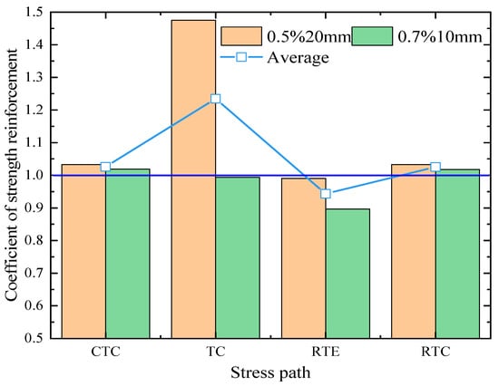 The coefficient of strength reinforcement is calculated for each sample, and then the same sample at 100 kPa, 200 kPa, and 400 kPa is averaged. The coefficients of strength reinforcement vary with fiber content under RTC conditions, as depicted in Figure 15. All of the fibered clay obtained a coefficient of strength reinforcement larger than 1.0 on average, which means that the fibers reinforced the clay, though it is very limited. For a fiber length of 5 mm, the reinforcement coefficient increases with fiber content; contrarily, for a fiber length of 20 mm, the reinforcement coefficient decreases with fiber content, while for fiber lengths of 10 mm and 15 mm, the maximum reinforcement coefficient mainly locates in the middle fiber content, though it varies with clay samples. This indicates that sufficient fiber content is needed to set up reinforcement, while a large amount of long fibers may weaken the local cells of samples and then decrease the sample’s strength. Figure 16 compares the stress path conditions (CTC, TC, RTC, and RTE) utilized for fibered clay assembled as 0.7% 10 mm and 0.5% 20 mm, as well as bare clay. The reinforcement ratio is highest in the CTC condition, but it reveals little for RTC and RTE conditions, especially in the RTE condition where there is even a slight decrease in strength. Note that the reinforcement is not considered as that high, as shown in Figure 16, because the values of bare clay in the TC condition are too small to regard them as reliable values.