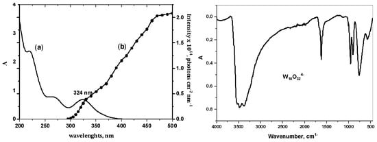 UV−vis spectrum of W10O324− (0.27 g/L), pH = 4.5, in aqueous solution (a) and solar light emission (b) (left) and FTIR spectrum of W10O324− (right).