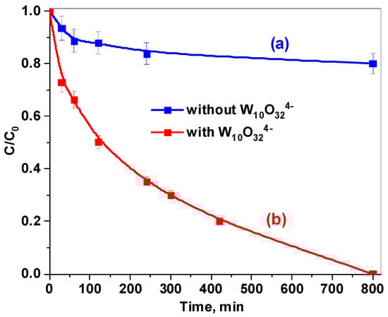 The SMZ UV absorption spectrum (Figure S1), recorded at 1.0 × 10−4 mol/L and pH = 4, shows two maximum wavelengths around 240 and 260 nm. Since absorption is observed at λ > 295 nm, SMZ is therefore susceptible to direct degradation by sunlight. Therefore, the photodegradation of SMZ (27.8 mg/L, pH = 4) in an aqueous solution was followed both in the presence and absence of W10O324− (0.5 g/L). The evolution of SMZ degradation as a function of irradiation time is presented in Figure 2.