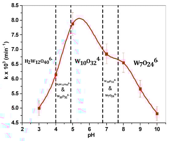Even if decatungstate is known as a very reactive species, it is necessary to control the pH in an aqueous solution because another species like H2W12O406− or/and W7O246−, absorbing at lower wavelengths, can exist in acid and alkaline conditions, respectively [,]. Therefore, the influence of pH was investigated, and the results are shown in Figure 3. Hence, the pH has a significant effect on the degradation kinetics of SMZ in the presence of decatungstate anions. The maximum efficiency is observed in a pH range of 5–6, with a rate constant of around 8 × 10−3 min−1, and it remains promising (above 6 × 10−3 min−1) at a pH similar to that of WWTP conditions.