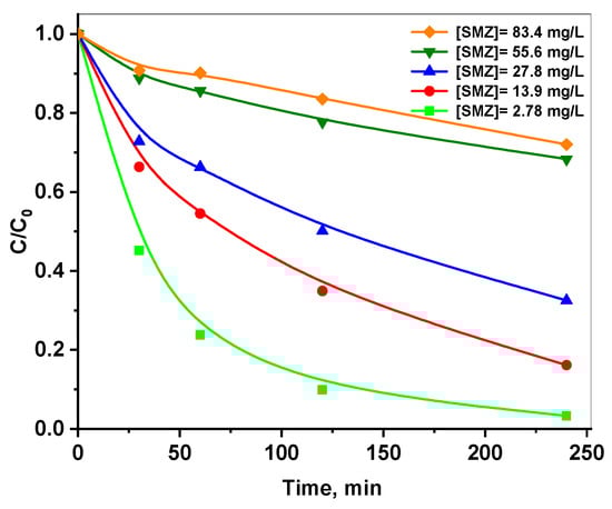 The effect of SMZ concentration on the photocatalytic process was studied in the range of 2 to 83 mg/L with a constant photocatalyst dose (0.5 g/L) and pH (7). From the results shown in Figure 4, SMZ degradation decreases with increasing SMZ concentration. At the lower concentration (10−5 mol/L ≈ 2.78 ppm), SMZ disappears completely after 6 h of irradiation with a rate constant around 24 × 10−3 min−1 and a half-life time of 30 min. However, with the highest concentration, k and t1/2 are 14 times lower and 16 times higher, respectively, and SMZ is partially eliminated (Table 1). This is probably due to a larger amount of SMZ to be degraded and to an absorbance competition between SMZ and the decatungstate anions, this being unfavorable for the photocatalytic reaction [,,]. However, considering that the pollutant concentration under real natural conditions ranges from a few nanograms/liter to μg/L, it is reasonable to assume that this photocatalytic process could achieve complete degradation of SMZ and possibly its mineralization [,,].