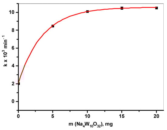 To determine the optimal dose of the photocatalyst (W10O324−), a solution containing 13.9 mg/L of SMZ was maintained at a constant pH (7), and various masses of Na4W10O32 were added to achieve concentrations of 0.16, 0.33, 0.5, and 0.66 g/L. Based on the determined initial rate constants (Figure 5), it was found that increasing the mass of the photocatalyst leads to an improvement in SMZ degradation until a plateau is reached for an optimal mass of 10 mg (equivalent to 0.33 g/L) (Figure 5). This is attributed to the potential aggregation of the photocatalyst at very high concentrations, which can lead to the formation of clumps. This, in turn, can reduce the surface area available for reactions and reduce the overall efficiency of the process [,,,].
