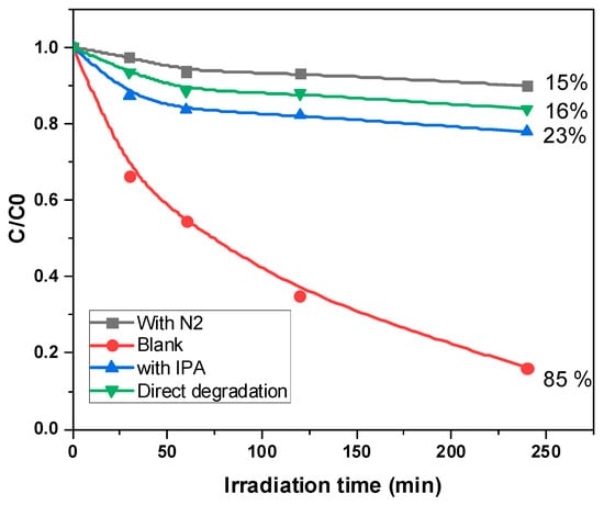 It is well known that the species involved in the photocatalytic oxidation reactions are usually the photogenerated radicals (HO•). To study their contribution to this photocatalytic process, a solution of SMZ was irradiated in the presence of decatungstate, adding small amounts (2% v/v) of IPA. This alcohol was described as the most effective inhibitor of HO●, with a rate constant of 1.9 × 109 M−1.s−1 []. The inhibition reaction proceeds according to Equation (3):