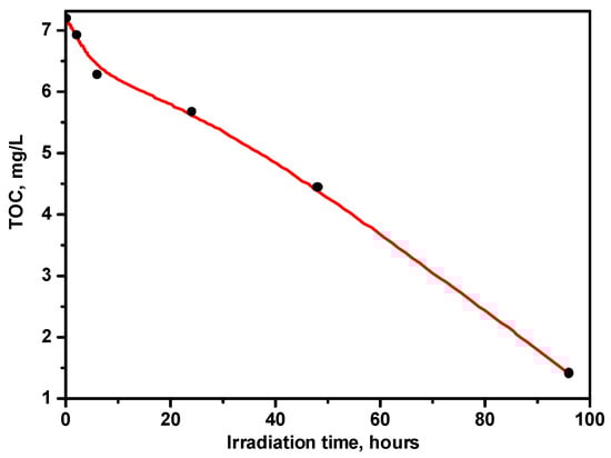 Total degradation of a pollutant results in the conversion of organic carbon to harmless gaseous CO2, while nitrogen and sulfur heteroatoms are converted to inorganic ions such as nitrate, ammonium, and sulfate ions, respectively. Figure 7 illustrates the mineralization profiles of SMZ at an initial concentration of 13.9 mg/L (equivalent to 7.2 mgC/L) in the presence of decatungstate anion photocatalysts at 0.33 g/L under UV-vis irradiation at a pH of 7. From Figure 7, it can be seen that the total organic carbon content decreases significantly upon irradiation without an induction period, and SMZ is completely converted into carbon dioxide in almost 100 h.