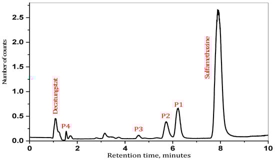 The irradiated solutions were analyzed with liquid chromatography coupled to electrospray time-of-flight mass spectrometry (LC–ESI+TOF–MS) in the positive mode. The chromatogram shown in Figure 8. is the one of a solution of SMZ irradiated 30 min in the presence of the decatungstate anion ([SMZ] = 13.9 mg/L; [W10O324−] = 0.33 g/L, pH = 7) with a conversion level of 30%.