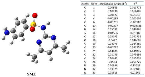Chemical structure and Fukui functions (f− f0) of SMZ.