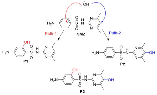 Accordingly, it can be suggested that the initial steps of SMZ degradation occur with the direct addition of the hydroxyl group to carbon C2 of the pyrimidine group (most favorable) and to a lesser extent to carbon C21 and C22 of the aromatic ring (Scheme 1).