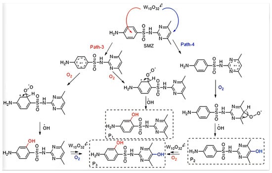 However, as we demonstrated that SMZ transformation could occur in the presence of a hydroxyl radical quencher, one can suppose the involvement of another mechanism. In fact, the photoproducts can also be formed with an electron transfer from the aromatic and pyrimidine groups to W10O324−* (redox process) followed by the addition of oxygen (pathway 3 and 4) (Scheme 2).