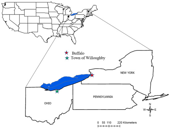 The study area showing the two cities, the town of Willoughby and Buffalo, near the Lake Erie Coast.