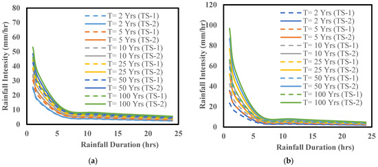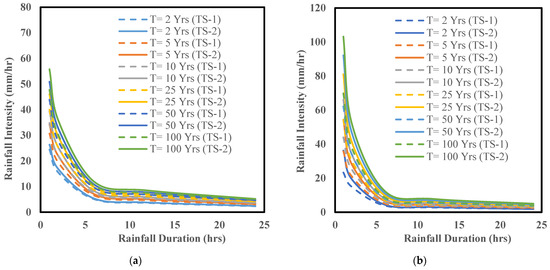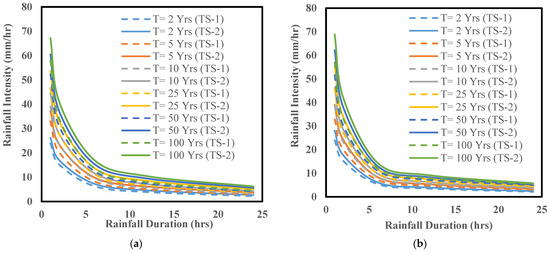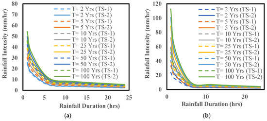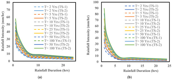 IDF curves for the baseline period from 1980 to 2019 (TS-1) vs. the near future from 2020 to 2059 (TS-2) considering a 2, 5, 10, 25, 50, and 100-year return period ensembling three CMIP5 RCP8.5 models for (a) the town of Willoughby (left panel), and (b) the city of Buffalo (right panel).