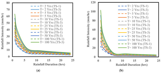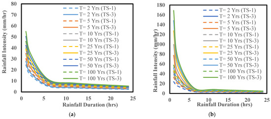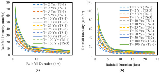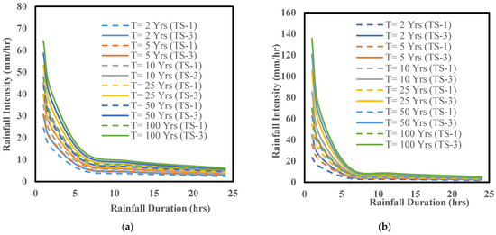 IDF curves for the baseline period (TS-1: 1980–2019) vs. the far future (TS-3: 2060–2099) considering a 2, 5, 10, 25, 50, and 100-year return period ensembling three CMIP6 SSP245 models for (a) the town of Willoughby and (b) city of Buffalo.