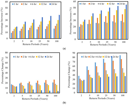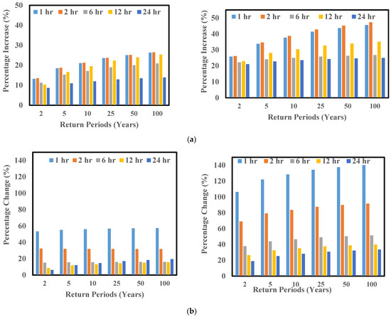 The left and right figures of the upper panel (a) represent the town of Willoughby, whereas the left and right figures of the lower panel (b) represent the city of Buffalo. The left graph of the upper panel shows the comparison of the percentage change in the rainfall intensity between the baseline period from 1980 to 2019 (TS-1) vs. the near future from 2020 to 2059 (TS-2), whereas the right panel shows the baseline period from 1980 to 2019 (TS-1) vs. the far future period from 2060 to 2099 (TS-3) for the town of Willoughby for different return periods and rainfall durations of CMIP5 RCP8.5. The exact interpretation is true for the city of Buffalo in the lower panel.