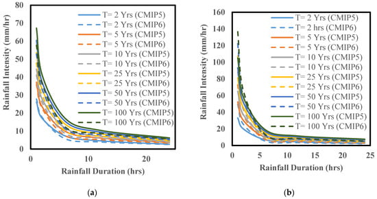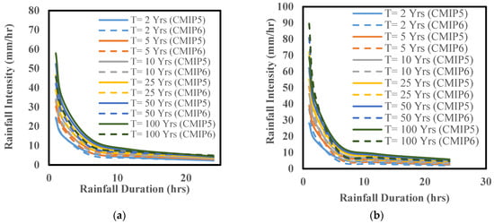 It is expected that CMIP6 simulations can reproduce historical climate variables, represent smaller biases in sea surface temperature, and be more skillful in capturing the precipitation pattern. The climate model simulations from CMIP6 seem to be more reliable than the earlier CMIP5 in various aspects. Different scientists have reported the limitations of CMIP5, especially in various scenarios and GCM output, due to the large reduction in atmospheric aerosol emissions for RCP scenarios [50]. Since more realistic results can be expected at various locations, especially for extreme precipitation, the application of the latest CMIP6 climate data is more crucial for storm sewer drainage systems. In addition, the multimodal median of CMIP6 (CMIP6-MMM) is expected to perform better than the individual model. Therefore, several models were used for IDF curve development.