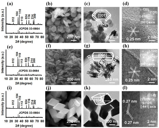 XRD spectra, SEM, TEM and HRTEM images of H_001 (a–d), H_110 (e–h) and H_104 (i–l) nanoparticles, respectively. Insets in the TEM and HRTEM images are the geometric models and the corresponding FFT patterns of hematite nanoparticles, respectively.
