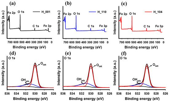 XPS survey spectra and high-resolution O 1s spectra of the H_001 (a,d), H_110 (b,e) and H_104 (c,f) nanoparticles, respectively.