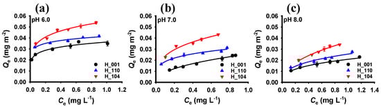 The surface area-normalized adsorption isotherms of phosphate on different-faceted hematite nanoparticles under pH 6.0 (a), pH 7.0 (b) and pH 8.0 (c) conditions. Experimental data were fitted to the Freundlich model (Equation (1)).