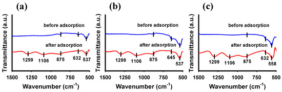 Previous studies proposed that the mechanisms of phosphate adsorption by iron oxides are mainly hydrogen bonding, electrostatic and ligand exchange interactions [26,48]. To further investigate the crystal facets-determined adsorption mechanism, the surface functional group compositions of the three hematite NPs and their changes before and after phosphate adsorption were characterized by FTIR spectroscopy. As shown in Figure 4, the characteristic peaks at about 537 cm−1, 558 cm−1, 632 cm−1 and 645 cm−1 in the FTIR spectra of hematite before and after the adsorption of phosphate corresponded to the stretching vibration of Fe-O functional group [49]. In addition, the peak at 875 cm−1 was attributed to Fe-OH vibration of the surface hydroxyl groups on hematite [48]. Meanwhile, the positions of the Fe-OH characteristic peaks in the three hematite NPs barely changed before and after the adsorption of phosphate, indicating that the hydrogen bonding between the hydroxyl groups on the surface of hematite and phosphate was negligible. In particular, the FTIR spectra (Figure 4) of hematite after adsorption of phosphate showed new characteristic peaks at 1106 and 1299 cm−1 compared to those before adsorption, which were usually attributed to the P-O stretching mode and P=O vibration mode of phosphate compounds (Figure S4), respectively [50,51,52]. These results further suggested that the phosphates were strongly interacting with the hematite NPs through electrostatic and ligand exchange interactions. The zeta potential usually represents the surface charge of the NP in solution, and the results in Figure 5a showed that the zeta potentials of the three NPs in aqueous suspensions were also not significantly different, suggesting that electrostatic interactions were not responsible for the differences in the adsorption of phosphate by the three NPs. Furthermore, the XPS survey spectra (Figure S5) of three hematite nanoparticles after adsorption of phosphate showed a P 2p peak at binding energy of 133 eV [53], while the Fe-OH (OHads) peak in the O 1s high-resolution spectra was weakened (Table S2). Therefore, the above results indicated that the main factor leading to the different adsorption of phosphate by the three NPs was the inner-sphere complexation formed by ligand exchange.