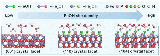 According to the position of the coordinating iron atoms on the surface of the iron oxides, the surface hydroxyl functional groups can be classified into single coordinating hydroxyl (–FeOH), double coordinating hydroxyl (–Fe2OH), and triple coordinating hydroxyl (–Fe3OH) functional groups [24,40]. Due to the differences in atomic arrangement on the different crystal facets of hematite, the corresponding surface hydroxyl species and densities are different [38]. For example, the –FeOH, –Fe2OH and –Fe3OH hydroxyl functional groups are present on the {102} crystal facet of hematite with densities of 5.1 sites nm−2, 5.1 sites nm−2 and 5.9 sites nm−2, respectively [37]. Previous studies have shown that inorganic ions or organic compounds preferentially undergoes ligand exchange with –FeOH groups on the surface of iron oxides [18,38,57,58,59]. Especially, Ding et al. proposed that –FeOH groups were the primary adsorption centers for ligand exchange between phosphate and iron oxides using in situ attenuated total reflectance (ATR)-FTIR spectra characterization, while the contributions of –Fe2OH and –Fe3OH groups in this process were negligible [56]. Therefore, we hypothesize that the content of –FeOH groups on the surface of hematite is the main factor influencing its facet-dependent adsorption of phosphate. To verify this speculation, the –FeOH functional group content of the three hematite surfaces were calculated as shown in Figure 5c. For three different crystal facets of hematite, the –FeOH site densities of the {110} and {104} crystal facets are reported to be 5.0 sites nm−2 and 5.3 sites nm−2, respectively, while the {001} crystal facet of hematite has only –Fe2OH sites [37]. Thus, the –FeOH site of the H_001 NP is located on its contained {102} crystal facet [29]. Combining the proportions of exposed crystal facets for each of the H_001, H_110 and H_104 NPs (Table 1), the –FeOH site densities of the three NPs were calculated to be 1.93 μmol m−2, 3.09 μmol m−2 and 8.71 μmol m−2 (Figure 5c), respectively [38]. Furthermore, the –FeOH site densities on the surface of the three NPs were analyzed by Pearson correlation with their Freundlich affinity coefficients for phosphate adsorption. The results showed that the Pearson correlation coefficients (r) were 0.995, 0.994 and 0.989 for pH 6, 7 and 8 conditions, respectively, indicating that the Freundlich affinity coefficients showed a significant positive correlation with single coordinating hydroxyl density (Figure 5g–i). Moreover, DFT calculations further analyzed the adsorption capacity of phosphate on the three crystal facets after replacement of –FeOH. The results (Figure S6) showed that the adsorption energy of phosphate on the {104} facet (−3.96 eV) is greater than that on the {110} (−3.36 eV) and {102} (−3.11 eV, H_001 NPs primary adsorption plane) facets, which is also consistent with the above results. Consequently, the main explanation for the differences in phosphate adsorption by hematite was the preferential ligand exchange of phosphate with –FeOH sites on the hematite surface (Figure 6), which was related to the facet-dependent density of –FeOH sites on the hematite surface.