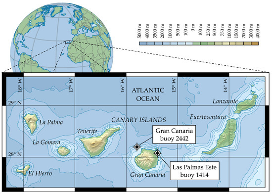 The data used to train the models were taken from two buoys (see Figure 2). The first buoy is Las Palmas Este (1414), which is located at 28.05° N and 15.39° W. This buoy is less than 2 km from the shore, with a mooring depth of 30 m; consequently, it can be regarded as a nearshore point. The second buoy is Gran Canaria (2442) buoy, which is located at 28.20° N and 15.78° W, around 8 km away from shore, and with a mooring depth of 780 m.