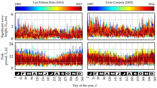 The buoy models are: SeaWatch for Gran Canarias (2442) [39], for depth waters, i.e., more than 200 m of profundity, and Triaxys for Las Palmas Este (1414) [40] in swallow waters, i.e., less than 100 m of profundity. Both buoys are part of the Deep Water Network and Coastal Network of Harbors of State (Puertos del Estado) of Spain. Each measurement taken by the sensors is processed and stored on board the buoys and transferred via satellite on a temporary basis [41].