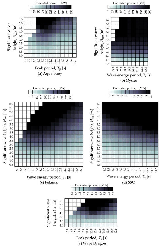 The converters considered also differ in their dimensions and power capacities. Thus, SSG and Wave Dragon are large devices, Oyster and Pelamis are medium-sized, and Aqua Buoy is a smaller device. Their respective conversion matrices are graphically represented in Figure 4.
