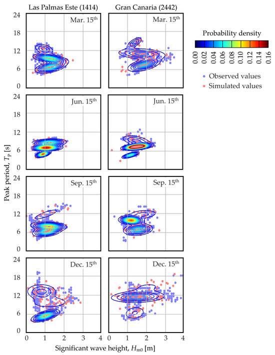 Firstly, the converters considered were assessed every day of the year. In order to exemplify the results obtained, Figure 5 shows the fitted probability distributions for the 15th day of four representative months (March, June, October and December). As we can see, the probability distributions (contour lines) closely match the observed values of significant wave heights and peak periods (blue points).
