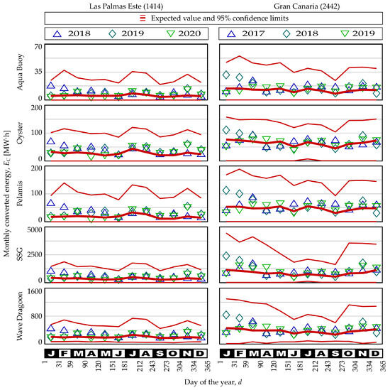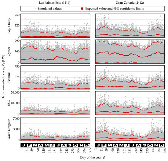 With the simulated data, the daily converted power is computed. Figure 6 shows the resulting values and the corresponding expected values and 95% confidence limits. Two main facts emerge from these outcomes. In the first place, the converted power is highest for the Gran Canaria buoy (2442) for all the converters evaluated, which agrees with the measured wave parameter patterns.