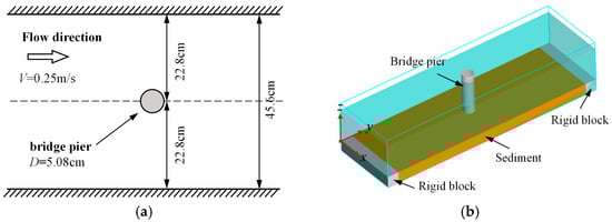 To verify the accuracy of the numerical simulation, the data from the physical model test conducted by Melville et al. [] were used in this study. The validation of the numerical simulation results includes both flow morphology and local scour morphology. The layout of the physical model test is shown in Figure 1a. The test flume was 19.0 m long, 0.456 m wide, and 0.44 m high. The water depth was 0.15 m, and the average velocity was 0.25 m/s. The bottom of the test flume was covered by sediment of 0.15 m in thickness. The median grain size of the sediment was 0.385 mm, the angle of repose of the sediment was 32°, and the density was 2.65 g·cm−3. The model of the bridge pier was placed in the center of the flume, with a diameter of 5.08 cm. The layout of the numerical model test is shown in Figure 1b. The meshing method and the setting of boundary conditions for the numerical model were the same as those detailed in Section 3.