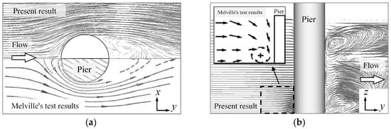 Comparison of flow morphology around the bridge pier: (a) x-y plane; (b) y-z plane.