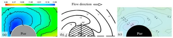 Figure 3 shows the morphology of the local scour pit around the bridge pier in this study and the results from other scholars. All shows that the area near and upstream of the pier and the area within a range of ± 75° in front of the pier are the main areas where local scour occurs. The area downstream of the pier is dominated by sediment accumulation. The maximum local scour depth found in this study is 3.96 cm, which is very close to the results of Melville [] (4.0 cm) and Zhang [] (3.8 cm).