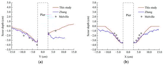 Comparison of scour-pit section morphology. (a) Longitudinal section at X = 0 m; (b) cross-section at Y = 0 m. Data were sourced from references [,].