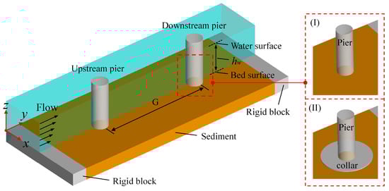 The numerical simulation model is shown in Figure 5. To be consistent with the referred studies [,], the numerical simulation model was built with a length of 24.0 m, a width of 9.0 m, and a height of 4.8 m. The velocity and depth (hw) of flow were 2 m/s and 3 m, respectively. The riverbed was composed of three kinds of sediments, and the particle sizes were 0.005 m, 0.01 m, and 0.02 m, with a density of 2650 kg/m3. There were two bridge piers arranged in tandem. These were located in the center of the model. The diameters, D, were 1.5 m. The distance between the centers of the two piers is represented by G. The collar was placed on the surface of the sediment, and the parameters of the collar are described in Section 3.3.