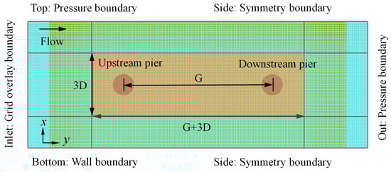 Meshing is a key part of the numerical simulation process, which is directly related to the accuracy of the numerical simulation results. According to the results reported by Sarker et al. [], the flow morphology around the bridge pier can be better modeled when the mesh size is less than or equal to D/20, which achieves more accurate simulation results. Also, the simulated efficiency must be considered, due to the computational resource limitation. Therefore, the mesh size of the model was changed gradually in this study. The mesh size grew gradually from around the bridge pier to the model boundary. As shown in Figure 6, the mesh size was initialized to D/20 within the center area (the yellow area) of the model and grew to D/10 near the model boundaries (inlet, outlet, and sides). The boundary conditions of the numerical model in this study were as follows: (1) the inlet was set as a grid overlay boundary, yielding a fully developed flow velocity distribution at the inlet. (2) The outlet was set for pressure, with a constant water depth. (3) Both sides were symmetrical. (4) The bottom was set as the wall. (5) The top was set as the pressure boundary, with a fluid volume fraction of 0. The roughness of the sediment surface was 2.5d50 (The median particle size of sediment). The simulation time was preliminarily set to 1000 s.