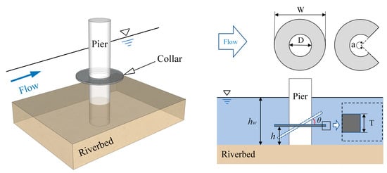 The collar is a classical scour reduction measure because of its simple structure and significant effect versus its low cost. It has been used widely all over the world [,,,,,,,,]. The sediment near the pier can be effectively protected from the downward flow and the horseshoe vortex generated around the pier with a collar. As shown in Figure 7, the main factors affecting the local scour reduction of the collar are the installation height (h/hw) and its size (W). Secondly, the shape, the tilt angle (θ), the protection range (a/2π), and the thickness (T) of the collar also influence the local scour reduction. Therefore, the effects of the above six factors were analyzed separately, as shown below, for the selection of the collar parameters in this study.